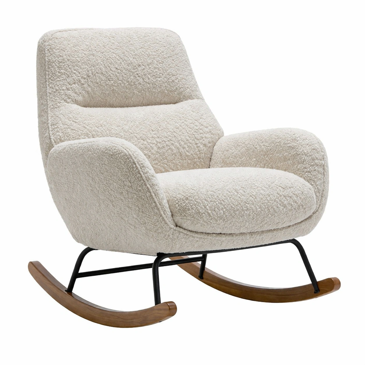 Silla mecedora de tela bouclé beige con estructura de metal y base de madera