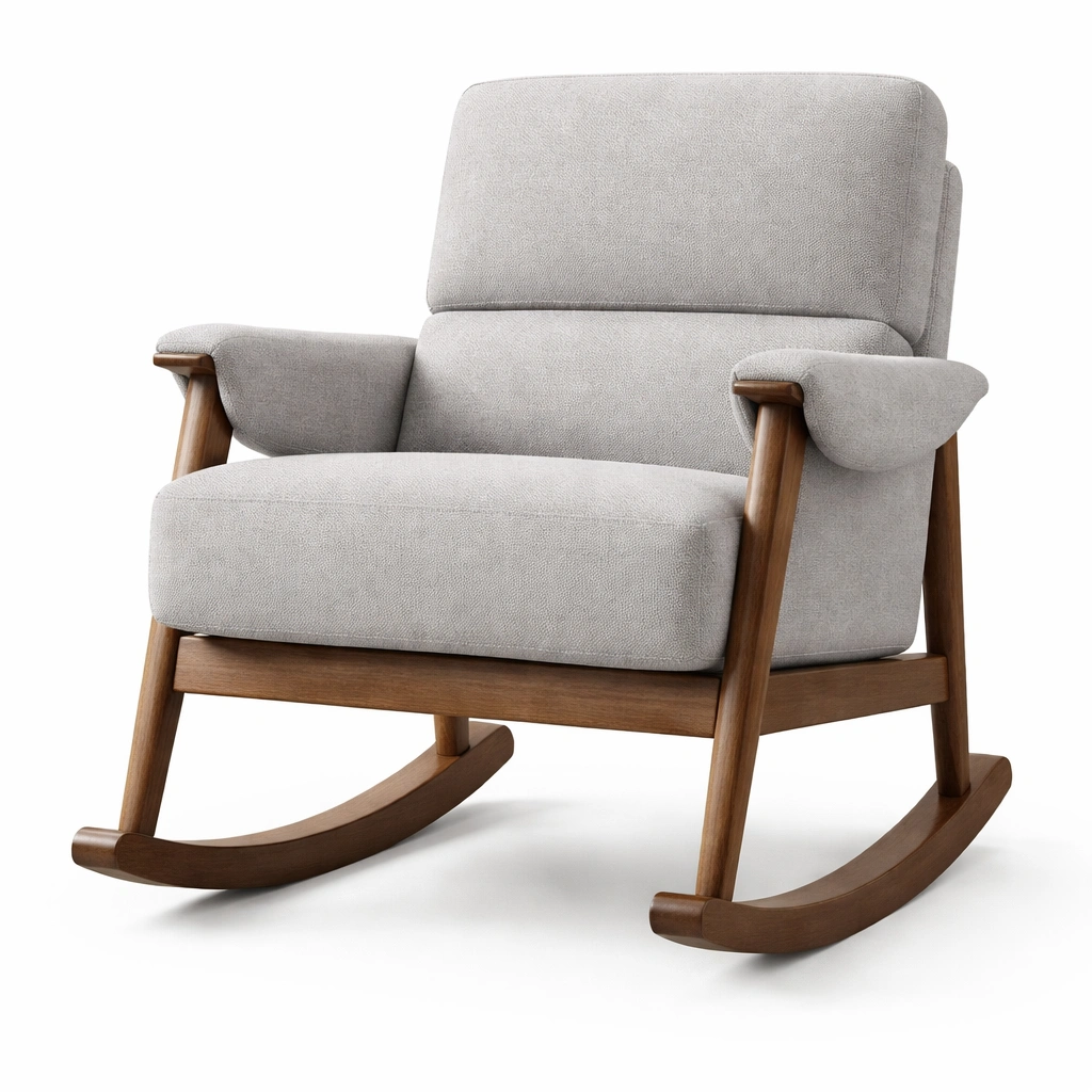 Silla mecedora de tela gris con base de madera